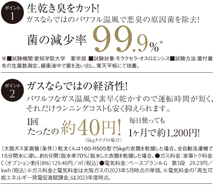 ガスのパワーでパワフル乾燥。おひさまに干したようなフカフカの仕上がり。雨でも夜でも花粉の季節もカラッと乾燥できます。