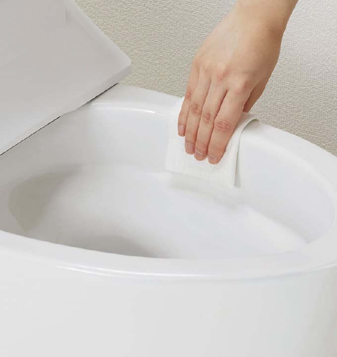 - 便器のフチを丸ごとなくし、サッとひと拭き、お掃除ラクラクです。