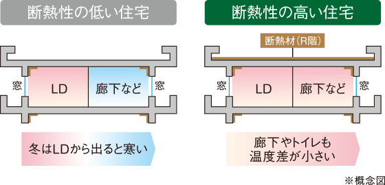 ZEH-M Orientedの高い断熱性能により、外気温の影響を受けにくく、室内の温度差が少ない快適な空間を実現します。エアコンなど冷暖房効果が持続しやすいため夏は涼しく、冬は暖かい、心地よい住環境を実現します。