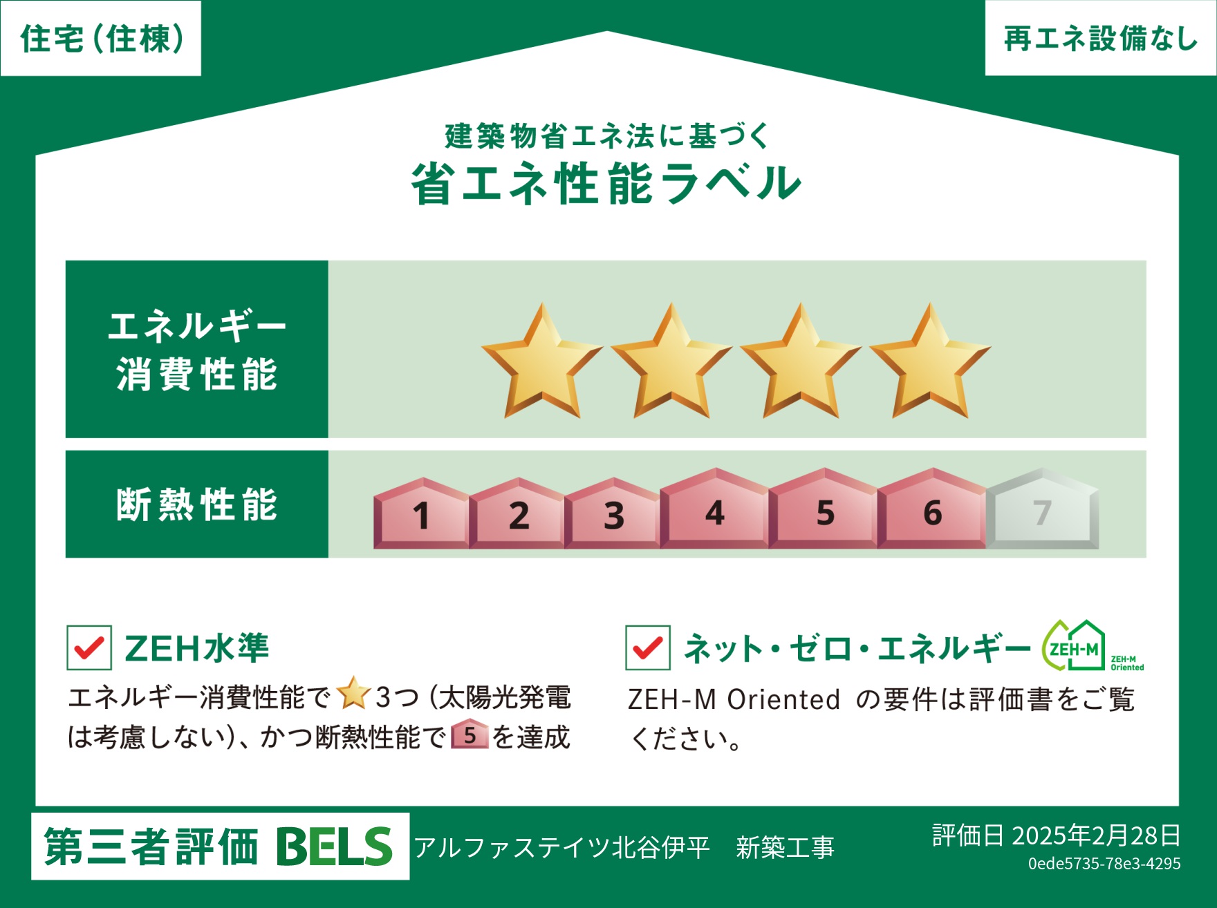 「アルファステイツ北谷伊平」は「BELS」(べルス)による第三者認証「4つ星」を取得しています。住宅の一次エネルギー消費量を計算し、5段階評価をつける制度で、評価は☆マークで表示され、星の数が多いほど性能が良いことになります。