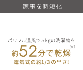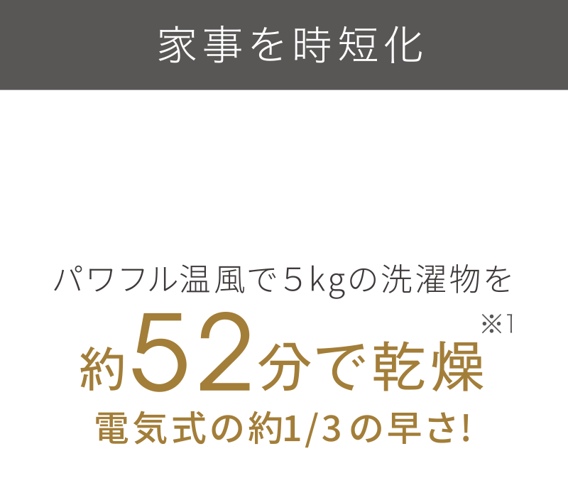 ガスのパワーでパワフル乾燥。ガスならではの、ふっくらやわらかな仕上がりです。また、うれしい除菌効果もあり、雨でも夜でも花粉の季節もカラッと乾燥できます。