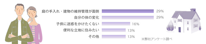 現在、一戸建てにお住まいの方に不安や悩みをうかがったところ、建物の維持管理を負担とされている方が多くみられました。また、一戸建ての場合、中心部から離れた立地に位置する場合が多く、「車が不可欠な場所では老後の買い物・通院が不安」という声も。