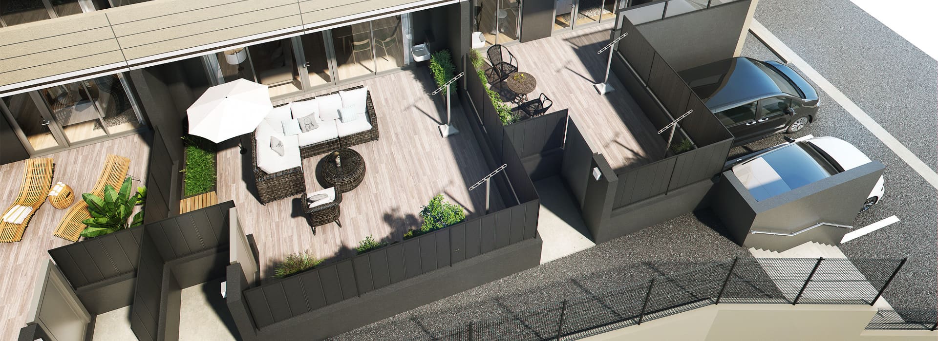 ※掲載の外観・エントランスアプローチ・テラス完成予想図は設計図面(2024年5月20日)を基に描き起こしたもので、実際とは異なる場合があります。行政官庁の指導または施工上の都合により、設計・設備・仕様等の変更がある場合がございます。また、植栽は竣工時ではなく生育後を想定して描いております。予めご了承ください。