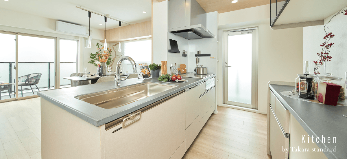 キッチンカウンターには、耐久性にすぐれた人造大理石天板を採用。機能美あふれるデザインです。