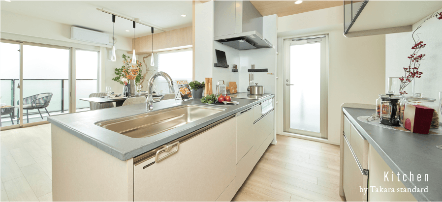 料理をしながらリビング・ダイニングの家族と会話が楽しめる対面式キッチンを採用しました。