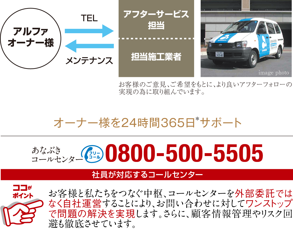 ご入居後の快適な毎日を送っていただくために、当社では万が一修理や故障が生じた場合を考え、アフターサービスを行う「アフターサービス担当」を配置しています。迅速な対応を求められることの多いメンテナンスは、専任のスタッフが対応し、きめ細やかなアフターサービスで快適なマンションライフのサポートを行います。