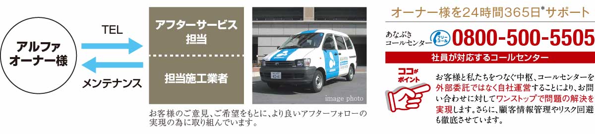 ご入居後の快適な毎日を送っていただくために、当社では万が一修理や故障が生じた場合を考え、アフターサービスを行う「アフターサービス担当」を配置しています。迅速な対応を求められることの多いメンテナンスは、専任のスタッフが対応し、きめ細やかなアフターサービスで快適なマンションライフのサポートを行います。
