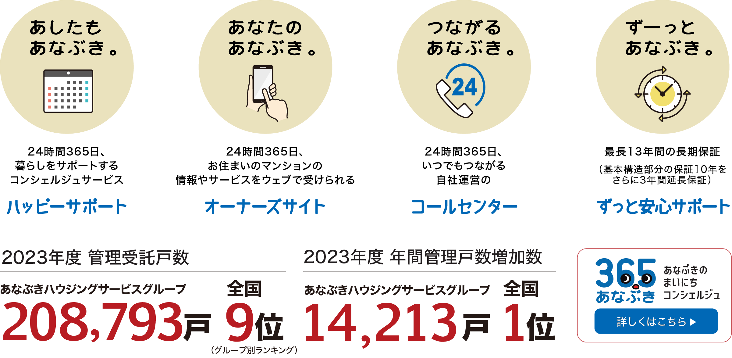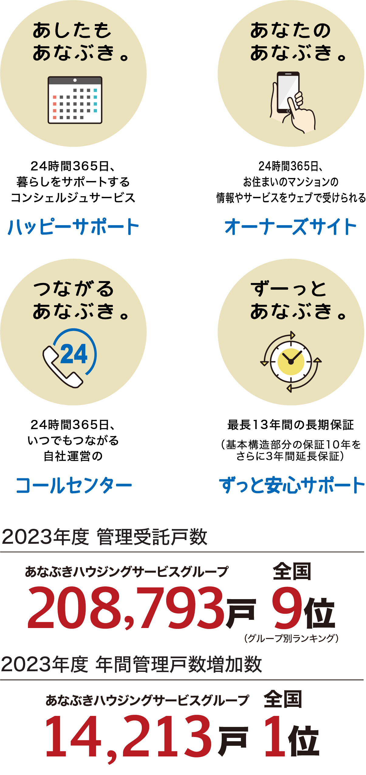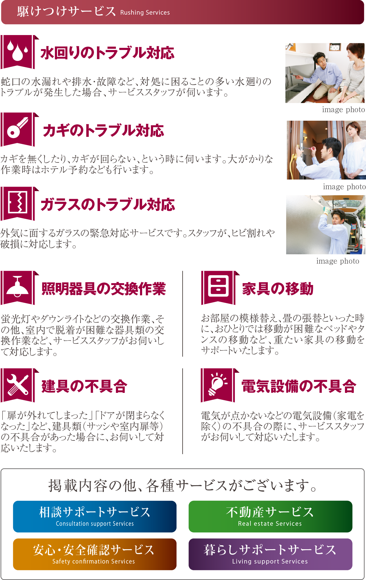 『ハッピーサポート』毎日の暮らしの中で感じる、さまざまな不安やトラブル。また、各種手続きや手配をお電話一本で対応いたします。例えば、水まわりのトラブルや照明器具の交換。家具の移動や医療に関するご相談などお気軽にご相談いただけます。