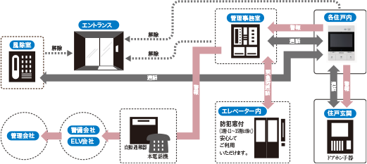 万が一非常事態や火災が発生した場合、住戸内にある非常用押しボタンで管理事務室に表示・通報、警備会社にも同時に通報され、非常事態に対処します。