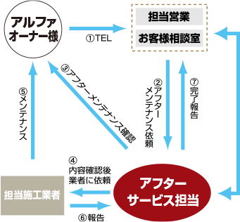 「アフターサービス担当」を配置しています。迅速な対応を求められることの多いメンテナンスは、専任のスタッフが対応し、