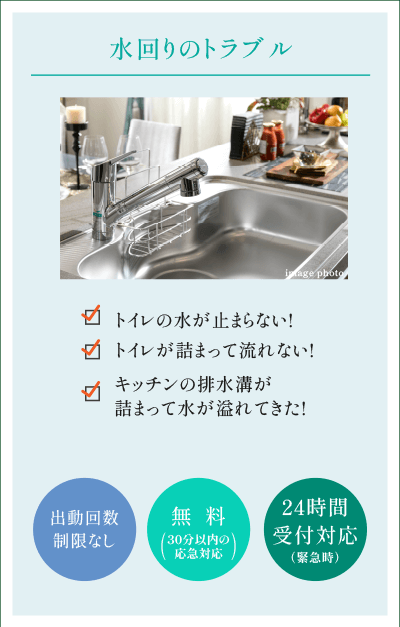 蛇口の水漏れや排水・故障など、対処に困ることの多い水回りのトラブルが発生した場合、サービススタッフが伺います。