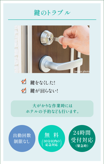 カギを無くしたり、カギが回らない、という時に伺います。大がかりな作業時はホテル予約なども行います。
