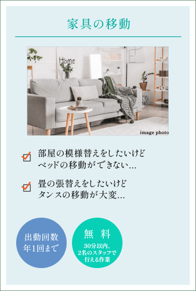 お部屋の模様替え、畳の張替といった時に、おひとりでは移動が困難なベッドやタンスの移動など、重たい家具の移動をサポートいたします。