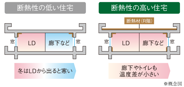 ZEH-M Orientedの高い断熱性能により、外気温の影響を受けにくく、室内の温度差が少ない快適な空間を実現します。エアコンなど冷暖房効果が持続しやすいため夏は涼しく、冬は暖かい、心地よい住環境を実現します。