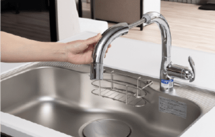 シンクの隅々までしっかり洗えるハンドシャワー水栓は、浄水機能付きです。(カートリッジ交換には別途契約が必要です。)