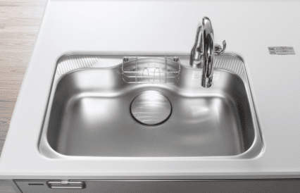 キッチンシンクは水跳ね音を抑えた低騒音タイプを採用。大きな鍋も洗える奥行ワイドなサイズです。