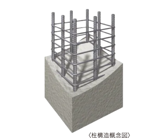建物全体をしっかりと支える柱は頑丈な鉄筋コンクリート造。固くて太い異型鉄筋を縦方向に配し、その周りに鉄筋のフープを巻き付け固定します。その上に型枠を組み込み、コンクリートを流し込んで固め、頑強な鉄筋コンクリートの柱に仕上げます。