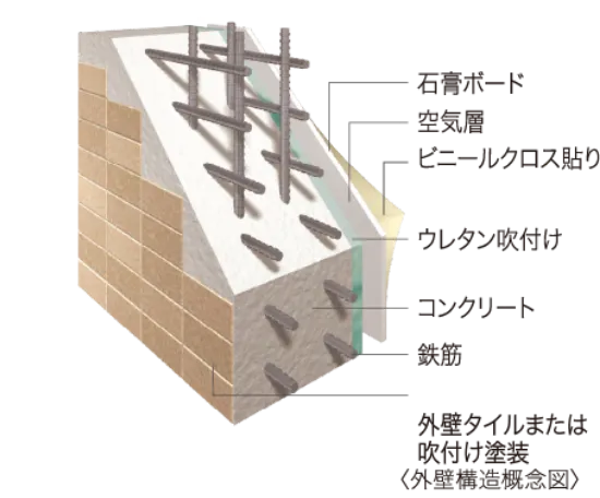 建物全体を包む外壁はコンクリートとし、耐久性のあるタイル(一部吹付タイル)と断熱材で、快適性を高めています。