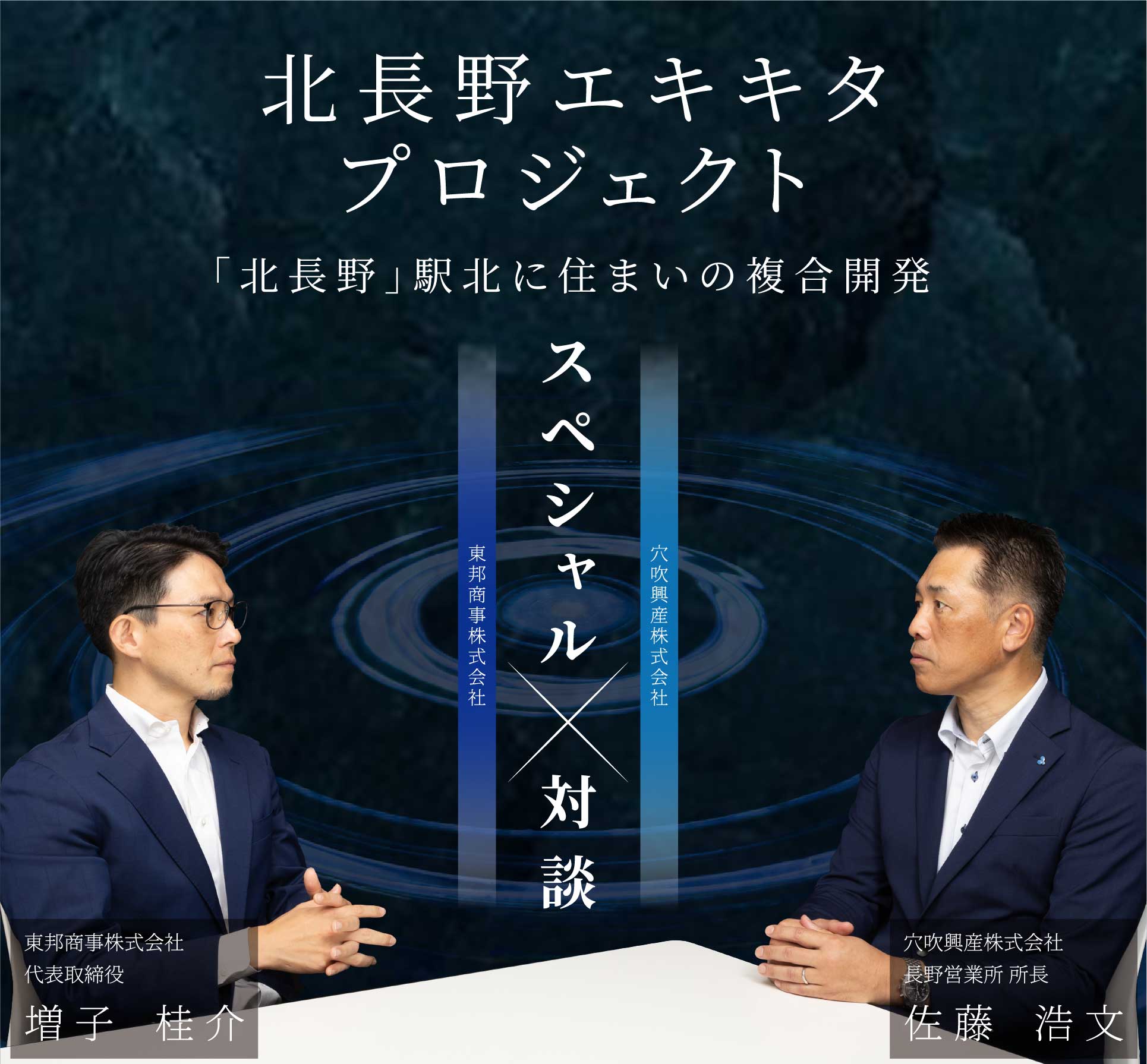 地元長野において宅地開発を中心に多彩な不動産事業で信頼を築かれてきた東邦商事さまと、分譲マンションを中心に幅広く不動産事業を展開している穴吹興産が、初めてタッグを組む一大プロジェクトです。お互いの強味を大いに活かせる、有意義な事業になっていくものと期待しております。