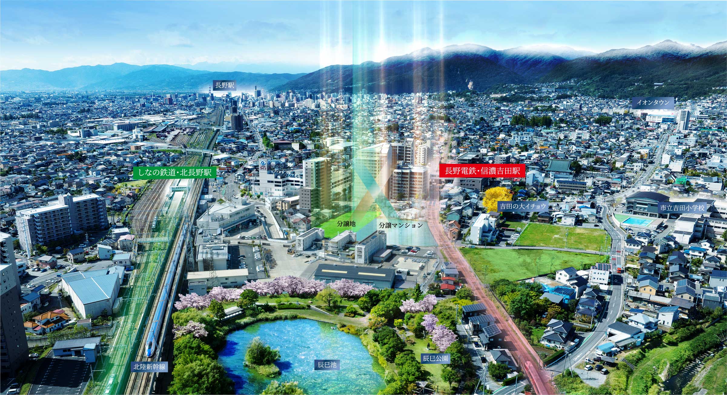 建設地は北長野駅の北側の「エキキタ」エリアで、しなの鉄道と長野電鉄のWアクセスが可能という非常に良い立地ですよね。しなの鉄道で長野駅まで1駅6分、長野電鉄で善光寺下駅まで5分で行ける。しかも、駅に近いけれども暮らしやすい静かな場所だと思います。元々、このあたりは歴史のある町で、市の天然記念物になっている吉田の大イチョウがあったり、水鳥が飛来したり桜がきれいな辰巳公園も身近にあって、自然環境も整っています。