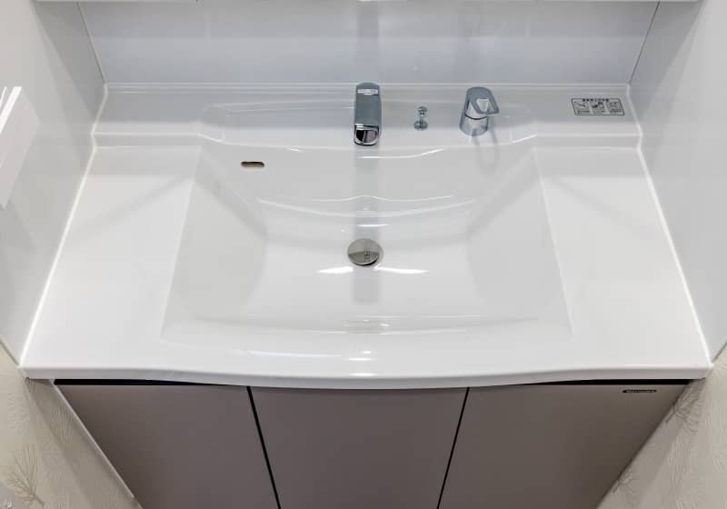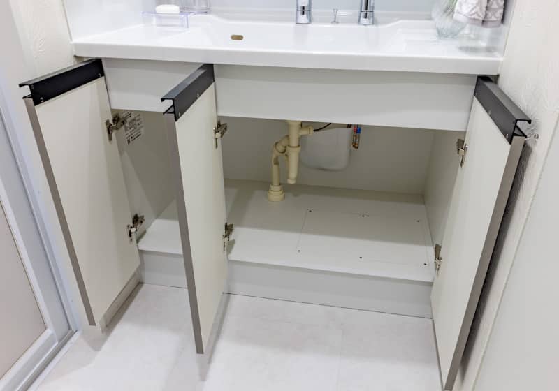 - 洗面化粧台のカウンター下部には、清掃用具などをしまうことができる収納スペースを設けました。