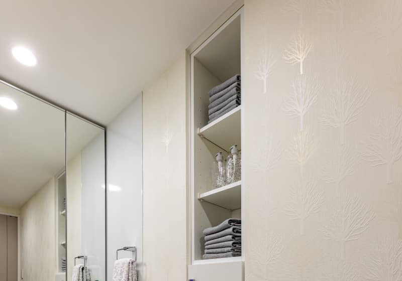 - 洗剤やタオル等の雑貨類、化粧品等もスッキリしまえる収納を設置しました。※各タイプにより形状が異なります。