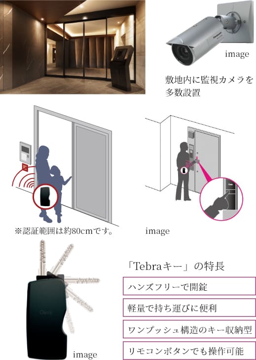 24時間体制の防犯システムに加え、先進のハンズフリーキー「Tebra」システムを採用。カバンやポケットにキーを入れておくだけで、1階のオートロックだけでなく各住戸の玄関ドアも解錠することができます。