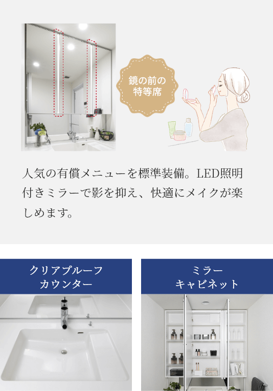 朝の身支度も、夜のリセットも、心地よく。清潔感と美しさが調和するサニタリースペースは、毎日を大切に生きるあたなにふさわしいプライベート空間です。