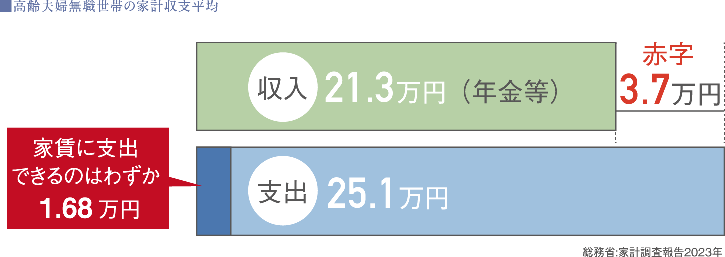 一生賃貸住宅に暮らす場合、高齢者になると物件を借りにくくなる傾向にあるため、住居の不安が残ります。また住み続ける場合でも定年後は主な収入が年金のみとなってしまいます。統計によりますと平均収入が約21万円程度に対し、支出は25万円とマイナスになり、蓄えを切り崩している現状がわかります。この中で住宅費はわずか1万円台。賃貸生活の場合は、到底家賃には足らず、家計に厳しい負担をかけることになります。