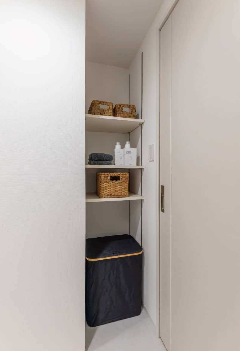 高さを自由に変えられる棚板で、細かな物から縦長の掃除機などの家電もフィット。
