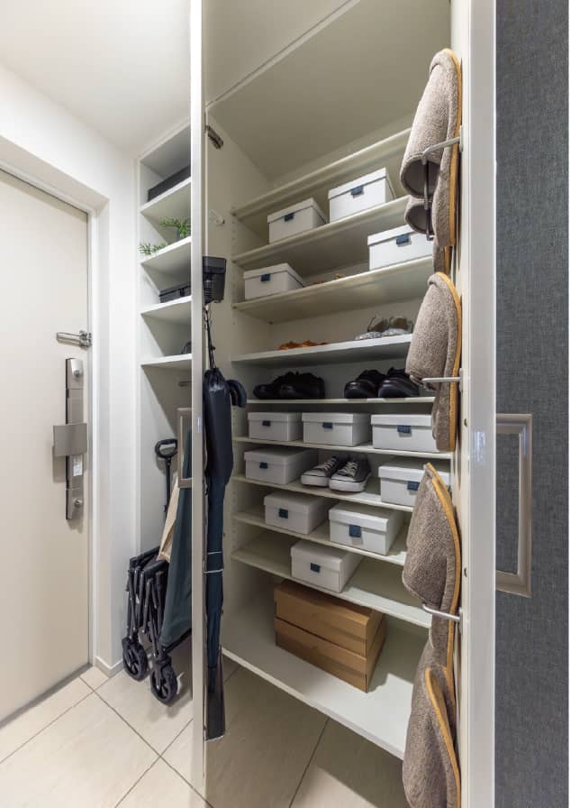 大容量で家族分の靴+来客用スリッパ、雨具も余裕で収納。