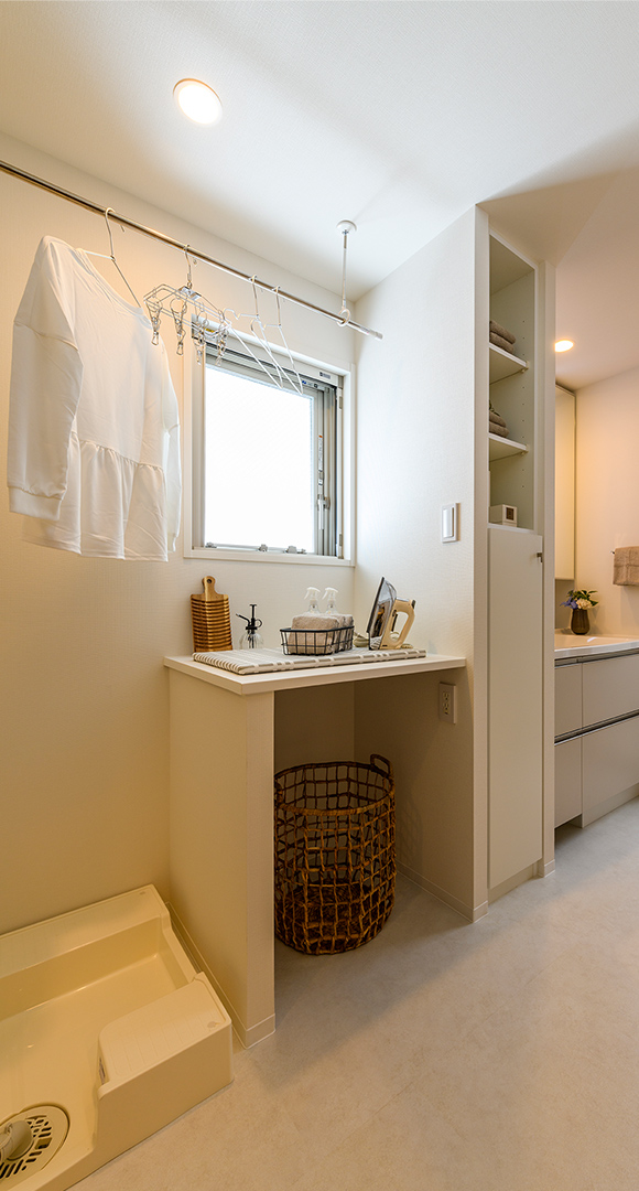 “洗う・干す・たたむ”が1箇所でこなせるように集約した、使い勝手のいいランドリースペースです。※Gタイプに採用
