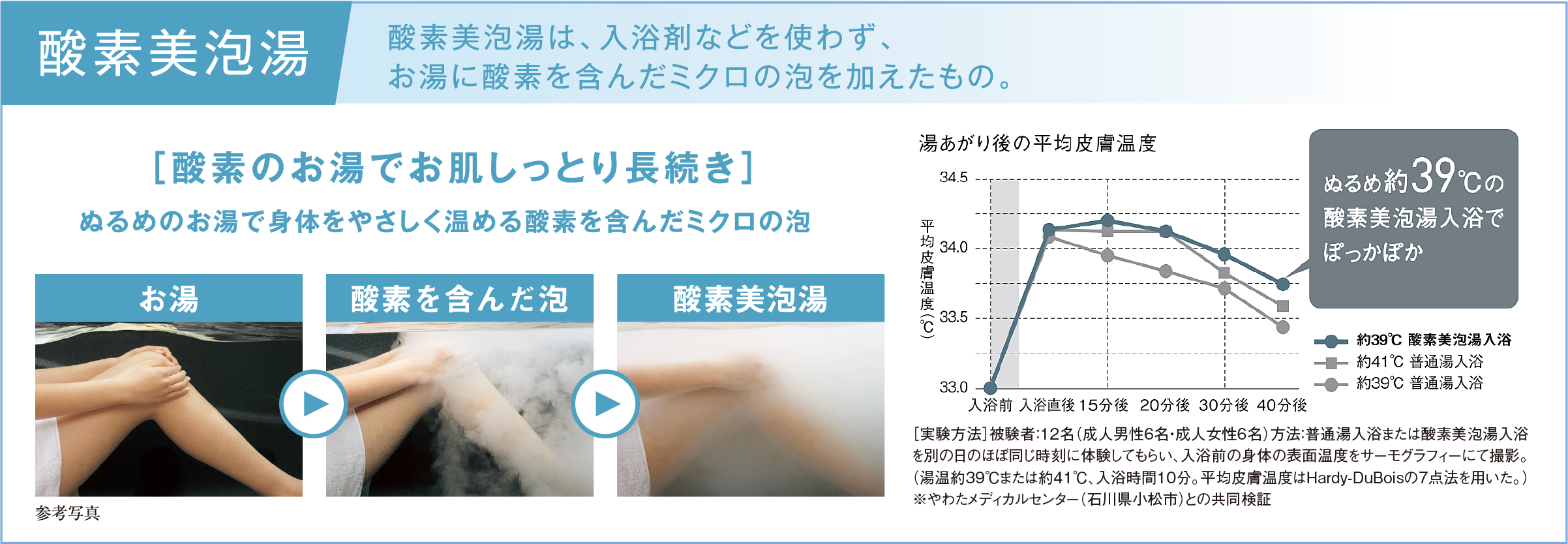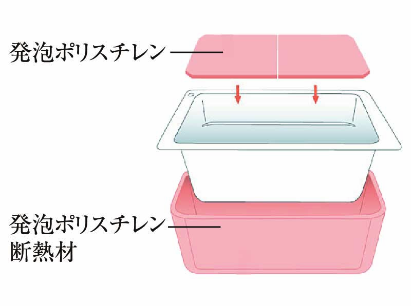 発泡ポリスチレン断熱材で断熱。5.5時間たっても温度低下は2.5℃以内。沸かし直しが減らせる浴槽。