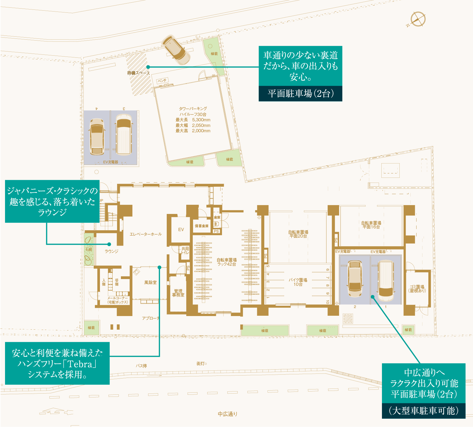 メインエントランスに面した中広通り側には、ちょうど目の前にバス停が配置されています。交通の利便性を活かしつつ、その通りからは駐輪場やバイク置場へ直接アクセスできるよう設計しました。ただし、通りに面する空間だからこそ、プライバシーと安全性には十分に配慮しています。自動扉を設置することで外部との明確な境界をつくり、さらにTebraキーによる認証システムを導入することで、居住者の方にとっては「出入りの手軽さ」と「セキュリティ」の両立を実現しました。
