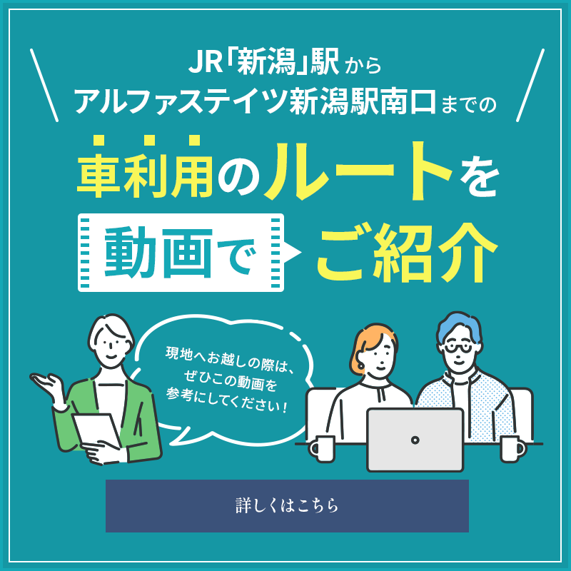※新潟駅(徒歩12分/約920m)、新潟駅南口広場(徒歩13分/約970m)、PLAKA1(徒歩10分/約770m)、PLAKA2(徒歩11分/約820m)、PLAKA3(徒歩12分/約950m)、ドンキホーテ新潟駅南店(徒歩13分/約970m)、ビックカメラ新潟店(徒歩11分/約840m)、CoCoLo新潟(徒歩12分/約920m)、太陽公園(徒歩8分/約570m)、万代シティ(徒歩21分/約1,660m)、万代シティバスセンター(徒歩21分/約1,660m)、新潟伊勢丹(徒歩22分/約1,760m)、LoveLa Bandai(徒歩21分/約1,660m)、LoveLa2(徒歩21分/約1,660m)、新潟日報メディアシップ(徒歩22分/約1,750m)
