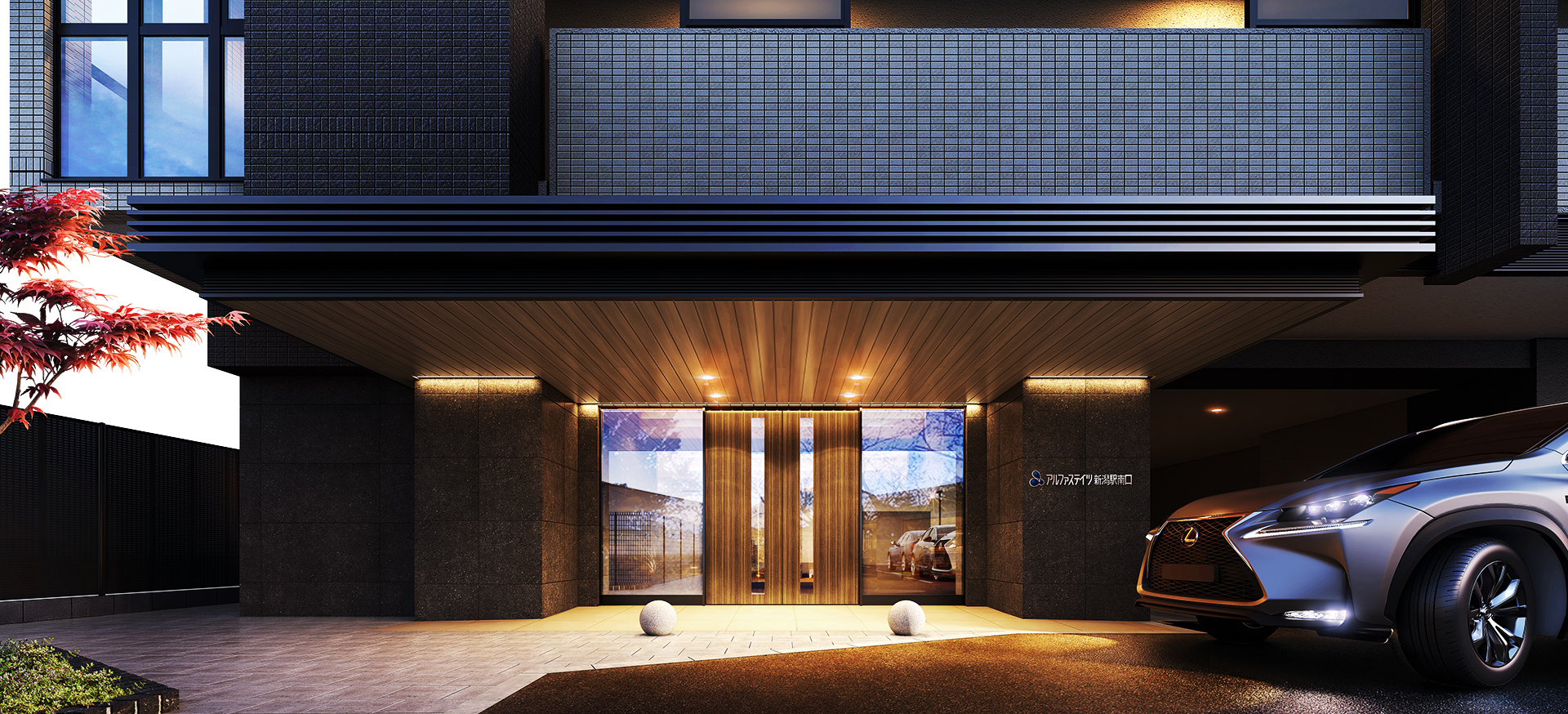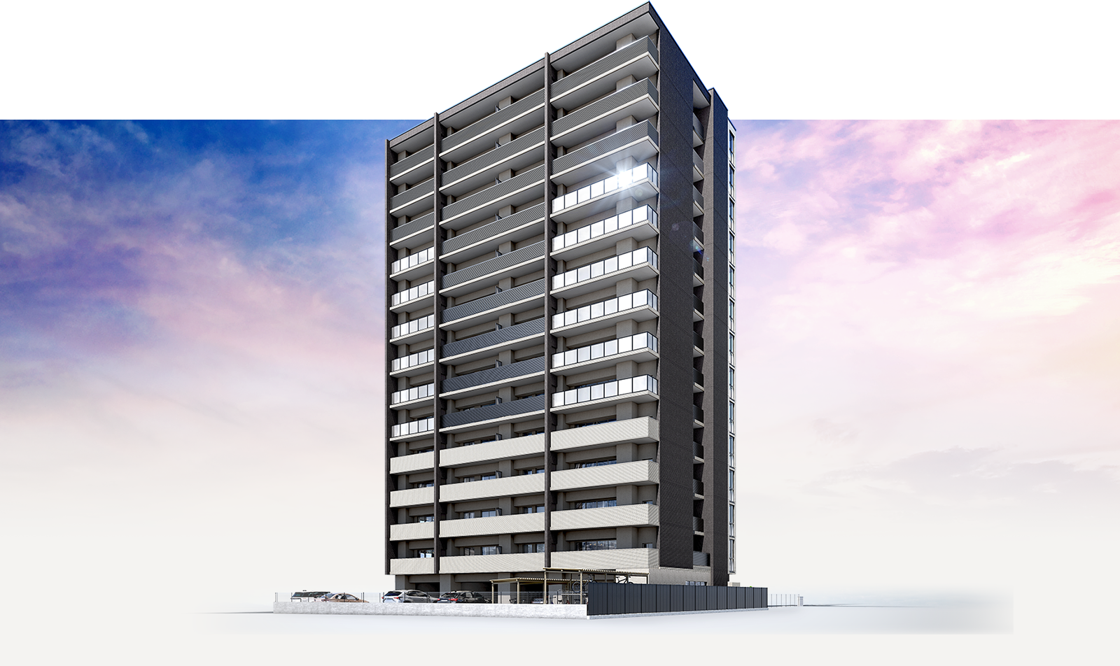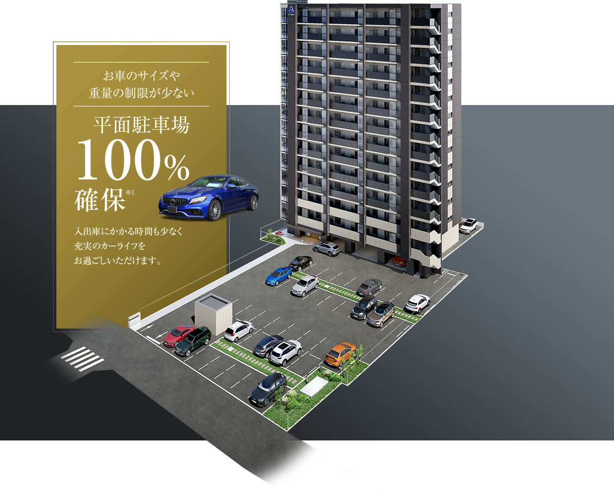 幹線道路から一歩奥まった静穏の立地に平面駐車場を100%確保したほか、全邸南向きの住戸を実現。