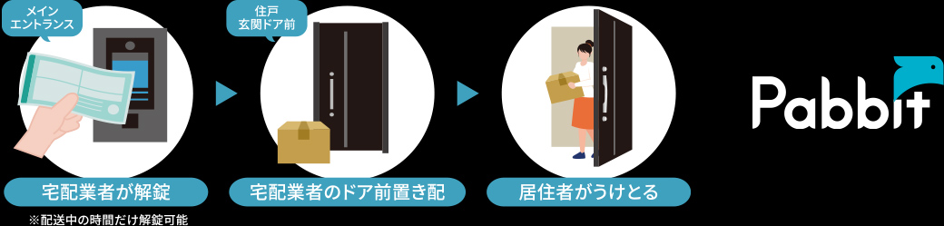 伝票番号が「鍵」になる機能で、荷物を各階のお部屋の前まで届けられる、スマートな宅配システム「Pabbit」。荷物の伝票番号を認証キーとしてオートロックを解錠できるので、居住者が不在でも各戸への置き配対応やご用意いただいた宅配バッグへ確実に配達できます。ヒトではなくモノ認証だから、誤配送やなりすましの予防効果も。利便性とセキュリティを備えたスマートな宅配システムです。