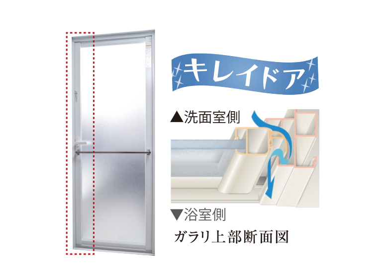 カビやすい浴室側のパッキンをなくし、汚れがたまりやすいドア下部のガラリをタテ型で配置して、汚れにくいドアを実現しました。
