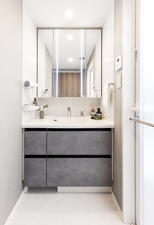 様々な角度で見られるワイドな三面鏡は、裏側が丸ごと便利な収納です。