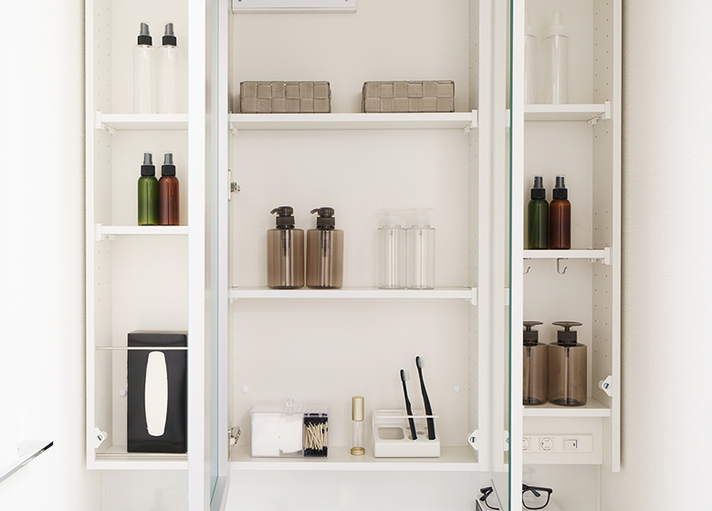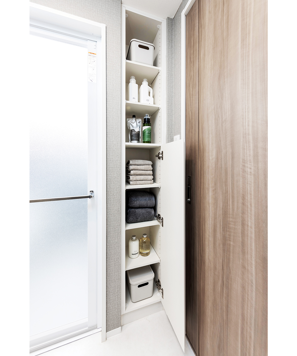 洗剤やタオル等の雑貨類、化粧品等もスッキリしまえる収納を設置しました。