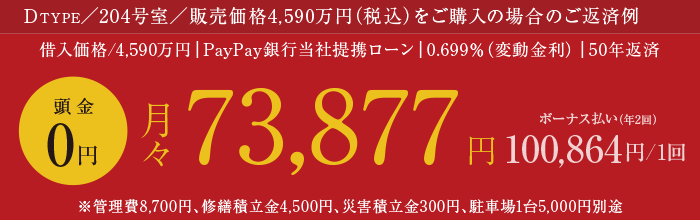 - ■提携住宅ローン概要・金融機関/PayPay銀行(当社提携)・お借入金額/500万円以上2億円以下(10万円単位)・お借入期間/1年以上50年以内・金利タイプ/変動金利・固定金利(2年、3年、5年、10年、15年、20年、30年、35年)から選択いただきます。・担保/借入れ対象物件(土地・建物)にPayPay銀行を第一順とする抵当権を設定します。事務取扱手数料/お借入金額に対して2.20%(消費税含む)の事務手数料がかかります。・当社指定保険会社の団体信用生命保険に必ずご加入いただきます。保険料はPayPay銀行が負担します。※引受保険会社/団体信用生命保険:カーディフ生命保険(株)および、カーディフ損害保険(株)※PayPay銀行では、「返済額5年同一定ルール」ならびに「返済見直し1.25%ルール」の取り扱いはございません。※掲載の返済例はご年齢・ご年収・既存のお借入れ状況等により実現できない場合があります。※掲載のローン概要は2025年12月時点のものです。