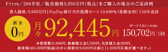 - ■提携住宅ローン概要・金融機関/PayPay銀行(当社提携)・お借入金額/500万円以上2億円以下(10万円単位)・お借入期間/1年以上50年以内・金利タイプ/変動金利・固定金利(2年、3年、5年、10年、15年、20年、30年、35年)から選択いただきます。・担保/借入れ対象物件(土地・建物)にPayPay銀行を第一順とする抵当権を設定します。事務取扱手数料/お借入金額に対して2.20%(消費税含む)の事務手数料がかかります。・当社指定保険会社の団体信用生命保険に必ずご加入いただきます。保険料はPayPay銀行が負担します。※引受保険会社/団体信用生命保険:カーディフ生命保険(株)および、カーディフ損害保険(株)※PayPay銀行では、「返済額5年同一定ルール」ならびに「返済見直し1.25%ルール」の取り扱いはございません。※掲載の返済例はご年齢・ご年収・既存のお借入れ状況等により実現できない場合があります。※掲載のローン概要は2025年12月時点のものです。