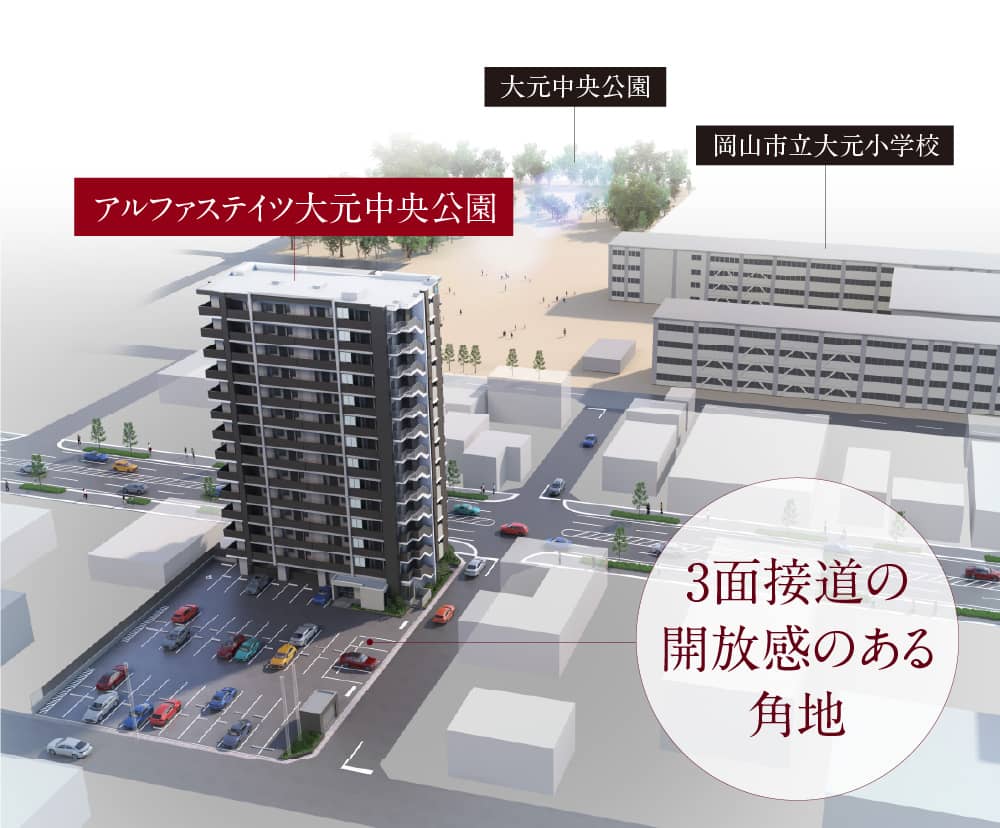 未来がひらく。 - 3面接道の角地により、駐車場率111%のゆとりと高いプライバシー性を確保。隣地の視線を気にせず過ごせる開放感と安心感が、ご家族の輝かしい未来を支えます。