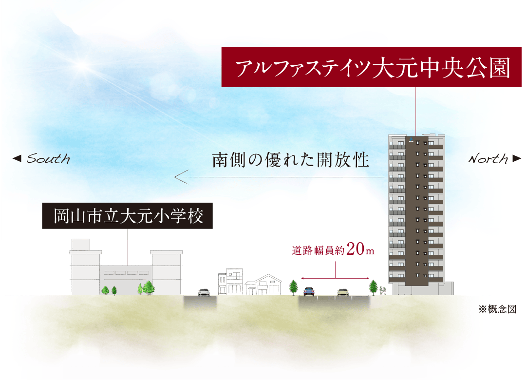 前面空地の開放性。 - 南側は道路に面し、学校や公園も近接。下層階から視界が開け、将来的な眺望変化の懸念も少ない好条件です。優れた採光と開放感が、ご家族の明るい未来を育みます。