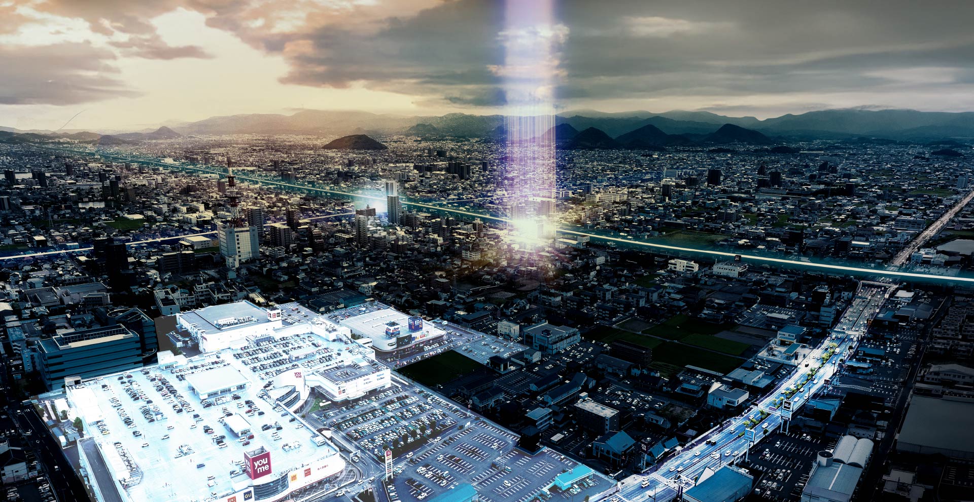 ※掲載の航空写真は現地周辺上空から撮影(20x24年8月)し、CG加工を施したものです。また、現地の位置を表現した光は、建物の高さや規模を示すものではありません。