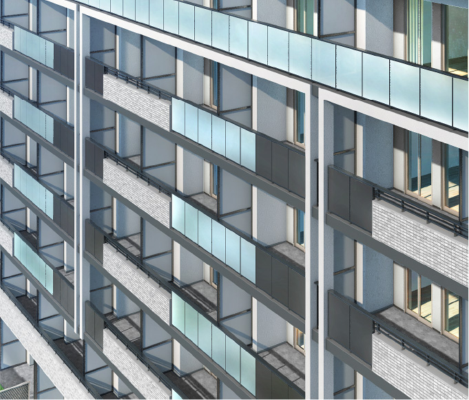 外壁にはタイル張り部分が多く、バルコニーの手すりにはガラスを多用している。このタイルとガラスは建材としての値段が高い。が、経年変化が少ない素材であるため、年月の経過とともに風格が増すという特性も備える。