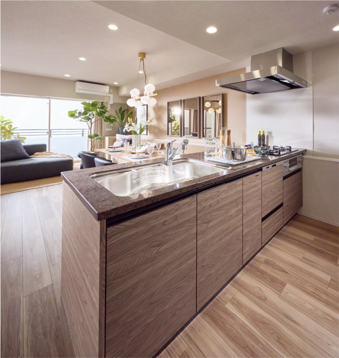 「キッチンがフルオープンになっている」という特徴を備えるマンションは多くない。その開放感は、ぜひ確認していただきたいポイントとなる。