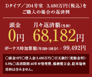■提携住宅ローン概要●金融機関/百五銀行●融資金額/100万円以上1億円以下(1万円単位)●融資期間/3年以上40年以内(6ヵ月単位)●金利/〈変動金利型〉0.8%※2025年11月の借入金利であり毎月見直しを行います。●返済方法/元利均等返済●団体信用生命保険/百五銀行負担●手数料/借入金額に対して2.20%(税込)※お借入日時点の消費税率が適用となります。●保証料/なし※融資条件等、詳しくは係員までお尋ねになるか、百五銀行WEBサイトの商品概要説明書をご覧ください。※ローン概要は2025年11月時点のものです。