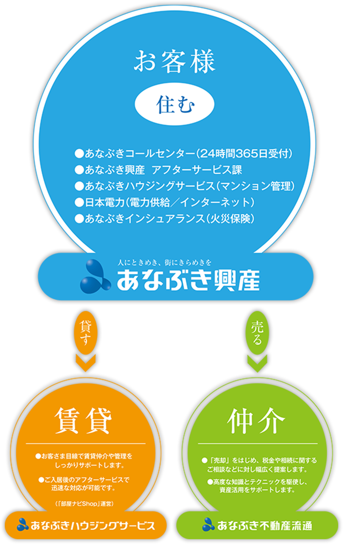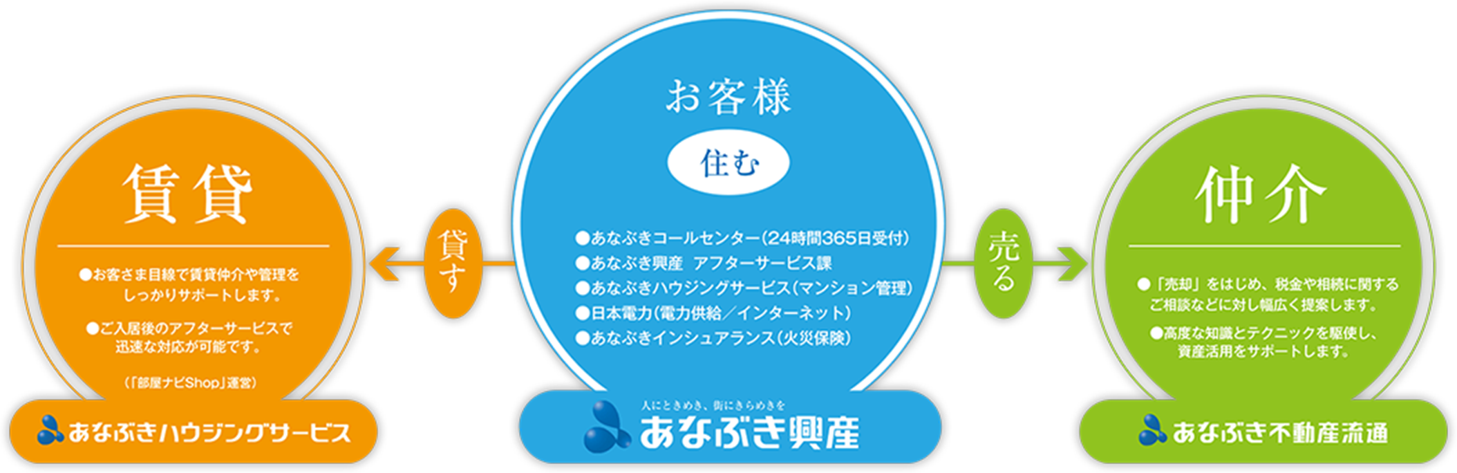 あなぶきは、住まいや不動産だけではありません。グループ一体となって、お客様の”暮らしのお困りごと”を解決し、サステナブルな社会の実現に貢献していきます。