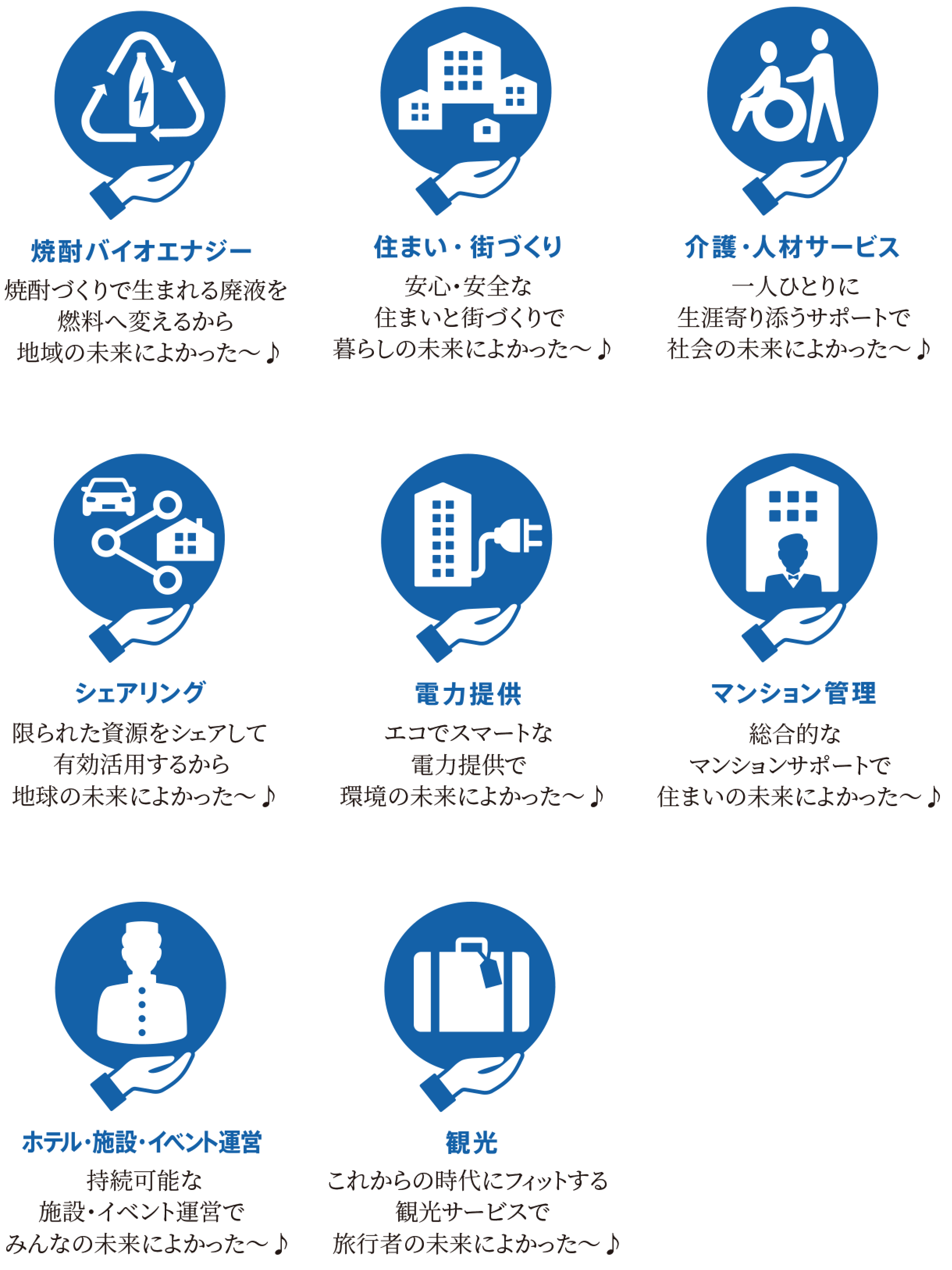 旅行、介護、建設、エネルギー、霊園等人々の暮らしに